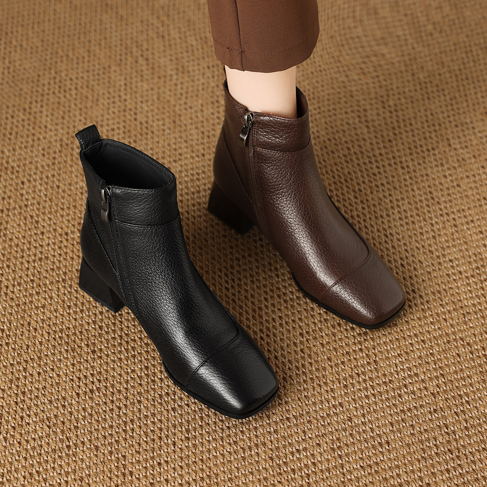 2025新款春秋季女鞋软皮靴子粗跟小短靴及踝靴秋冬女士中跟真皮鞋