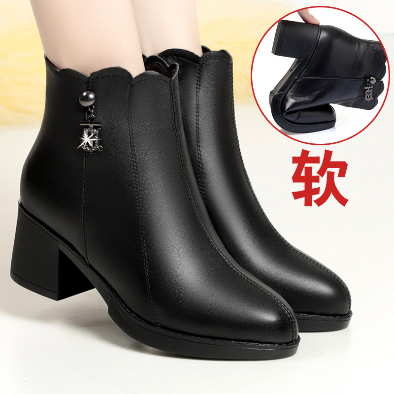 真皮靴子女冬短靴粗跟中跟妈妈鞋皮鞋女加绒保暖羊毛中年大码棉鞋