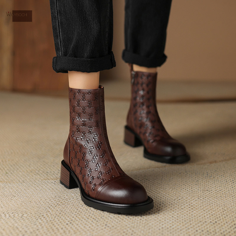 头层牛皮圆头中跟粗跟短靴压花时装靴冬季女士皮靴短筒真皮靴欧美