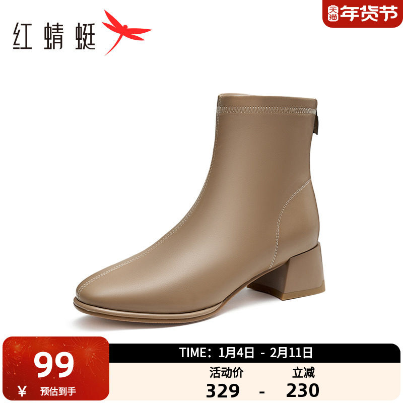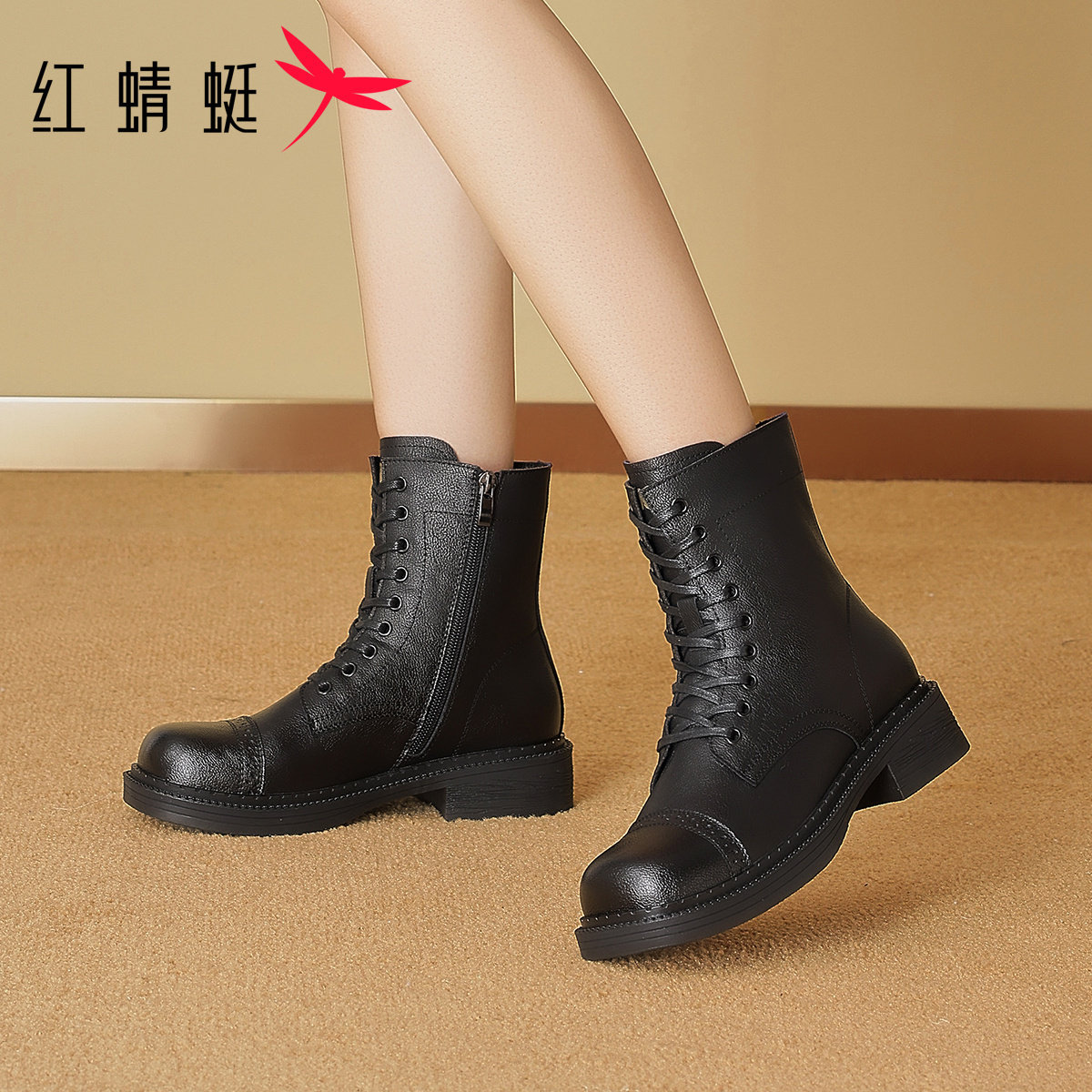 红蜻蜓黑色中跟马丁靴女款新款秋冬单靴时尚复古粗跟女靴软底皮靴