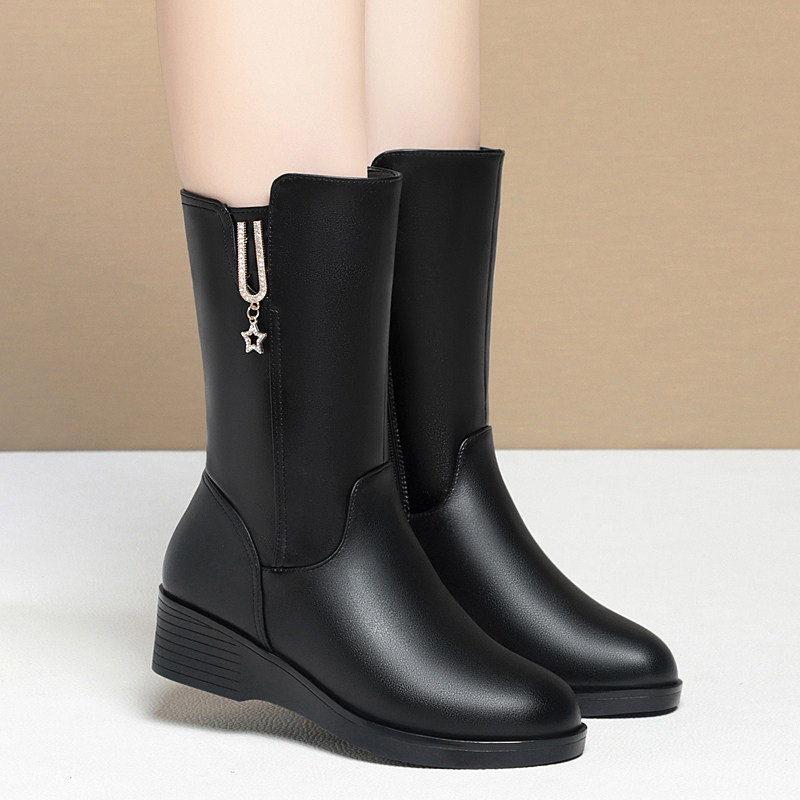 2025冬季女靴真皮中跟加绒羊毛中筒靴中年妈妈粗跟马靴半靴皮靴子
