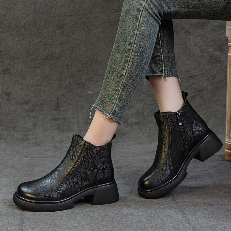 398中跟短靴民族风中粗跟软底防滑皮靴纯色侧拉链妈妈时装低筒靴