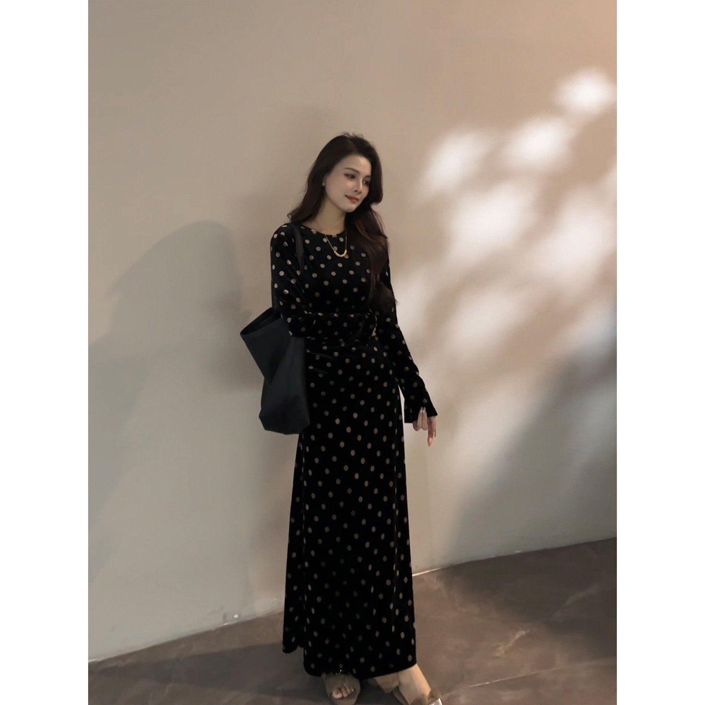 大婷婷 长裙波点绑带黑色显瘦裙子复古时尚秋冬新款连衣裙DT1867