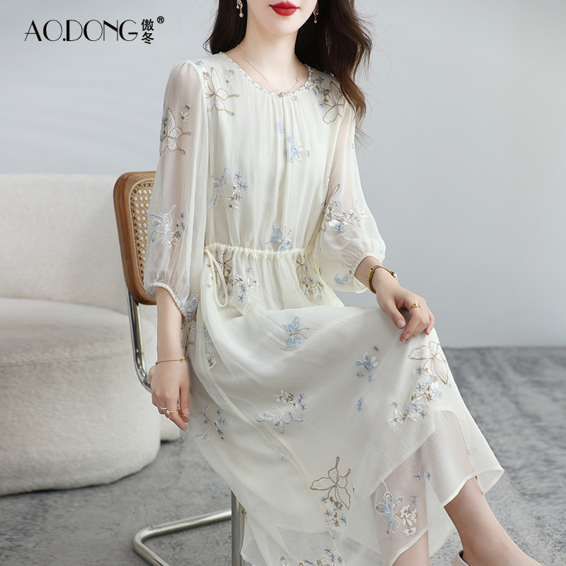 新款真丝连衣裙女装刺绣流行桑蚕丝中袖收腰显瘦法式优雅裙子夏季