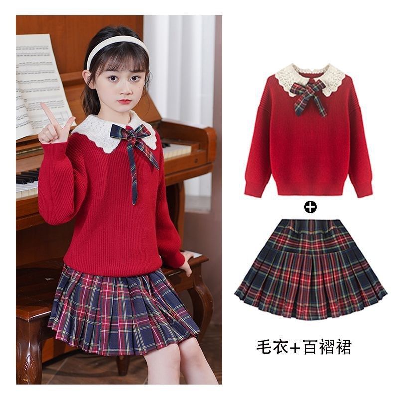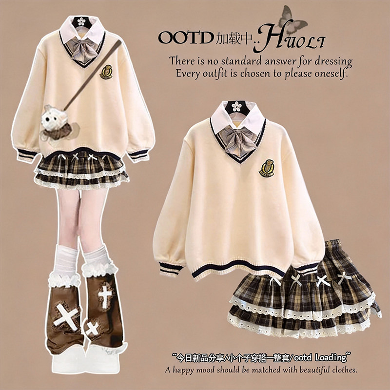 2026冬季套装女学生学院风假两件宽松毛衣格子蕾丝裙子两件套