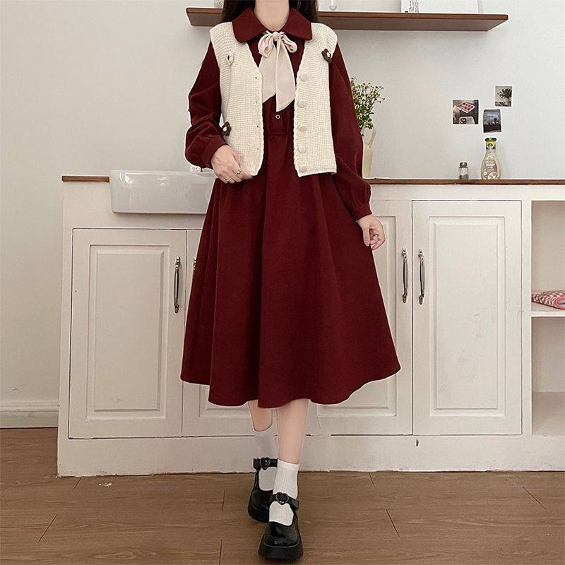 娃娃领连衣裙子少女秋冬2025年新款初中高中学生马甲长裙两件套装