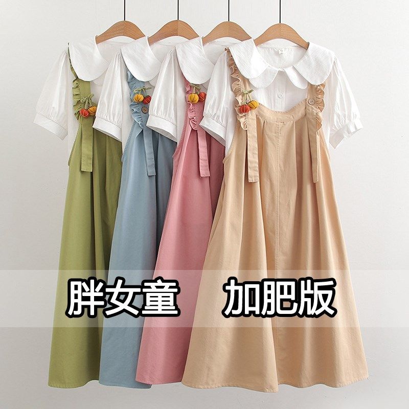 胖女童背带裙套装甜美可爱夏装加肥加大胖女孩大童学生两件套裙子