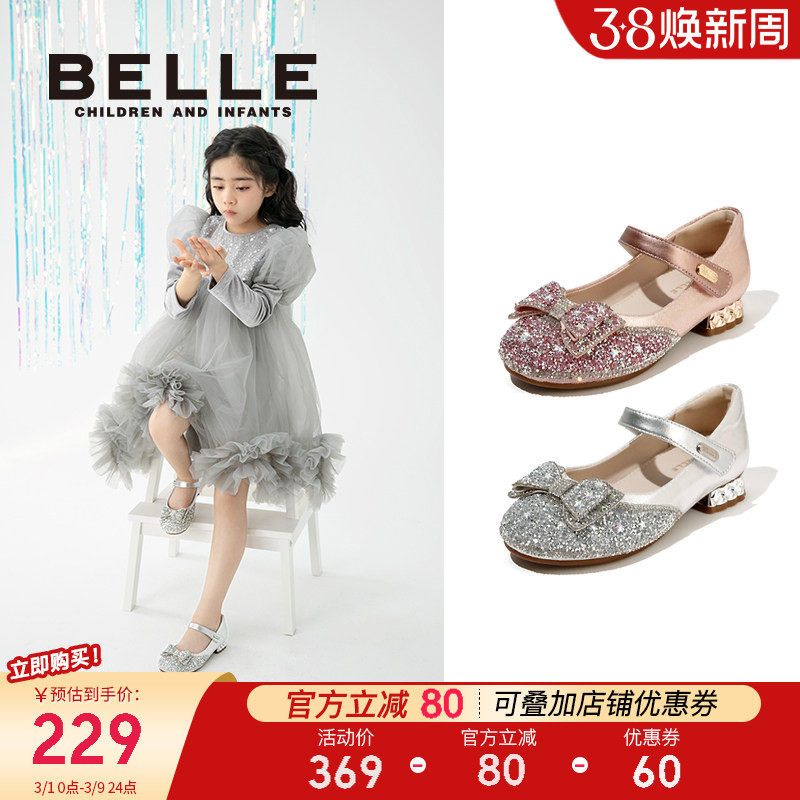百丽童鞋女童小高跟公主鞋春季新款儿童水晶鞋宝宝单鞋女童皮鞋子