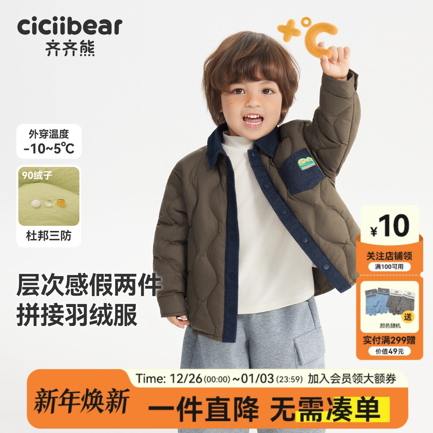 [杜邦三防]齐齐熊宝宝假两件羽绒服男童外套冬装儿童保暖校服神器