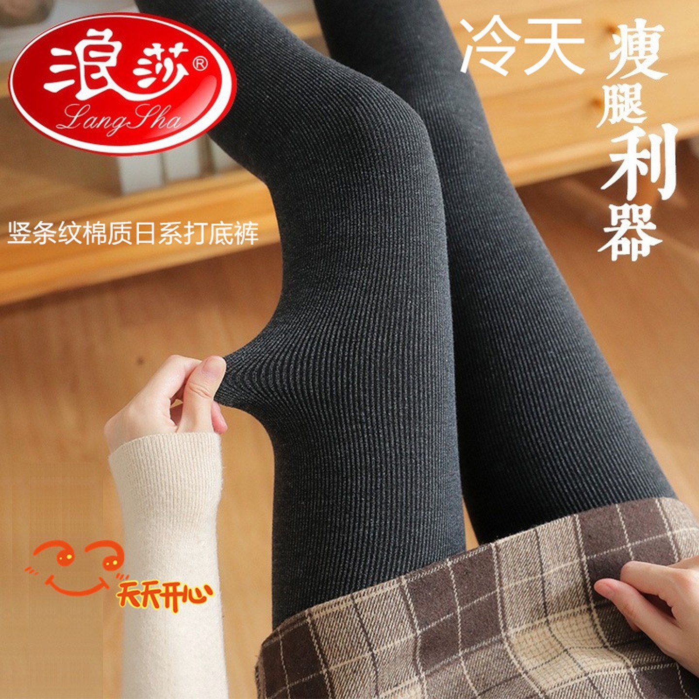浪莎螺纹女生打底裤袜薄款秋冬竖条纹内外穿棉质日系高腰显瘦袜裤