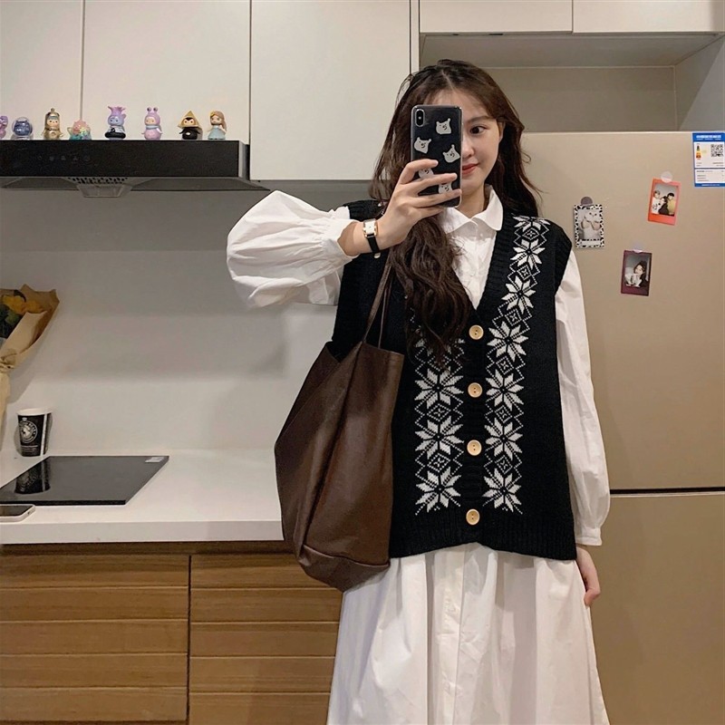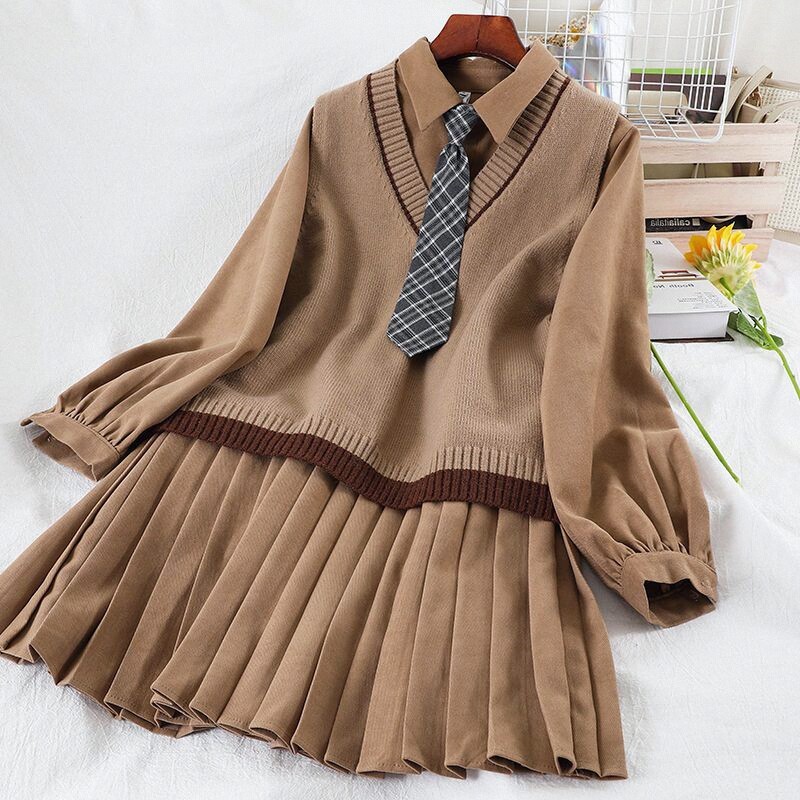 春秋新款学院风套装女学生韩版宽松百褶连衣裙针织马甲背心两件套