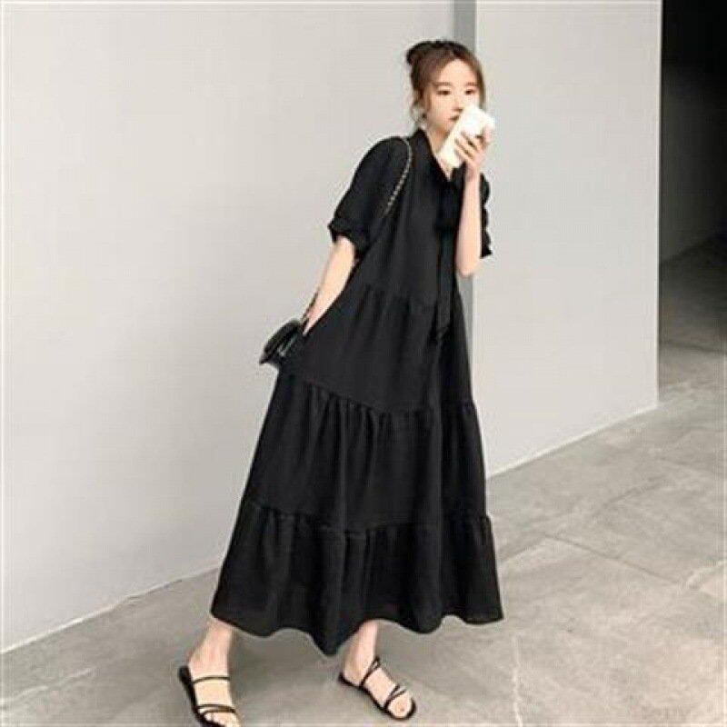 夏季新款短袖系带连衣裙女学生韩版宽松显瘦学院风中长蛋糕裙子潮