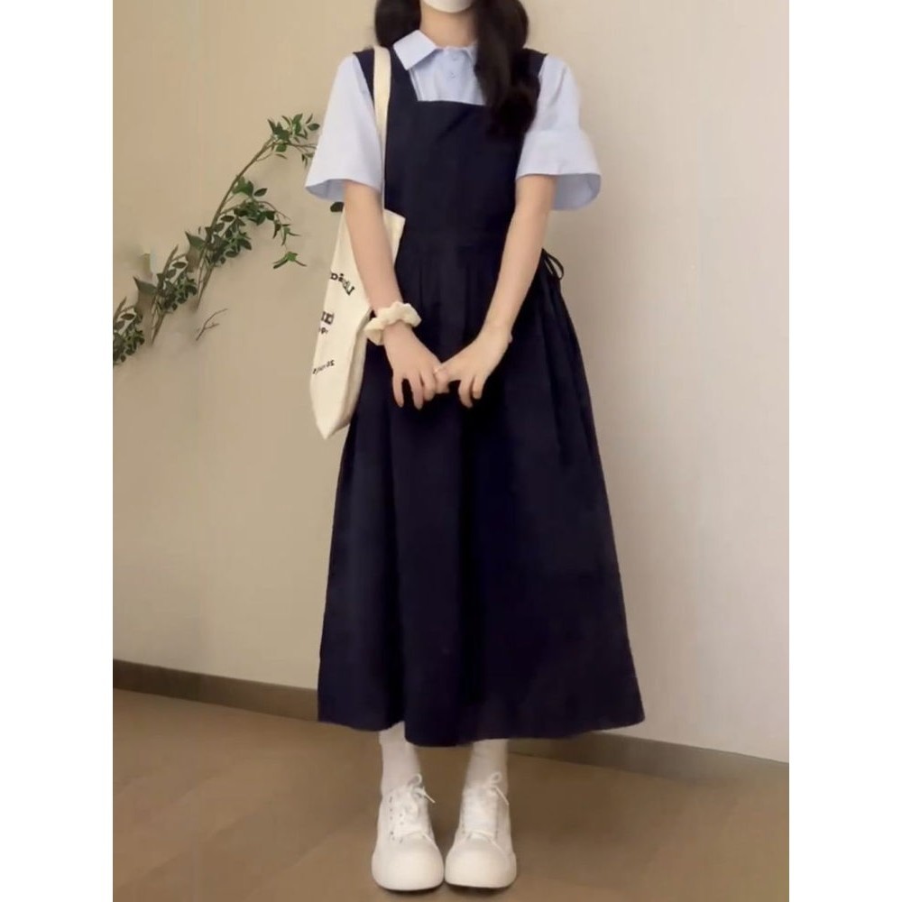 学院风甜美减龄背带连衣裙女学生夏季韩版蓝色衬衫+长裙子两件套