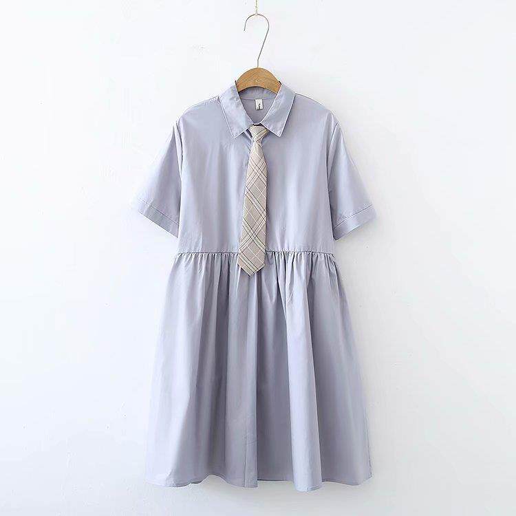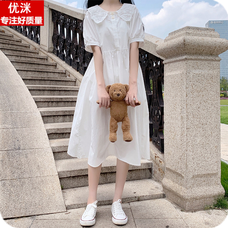 日系学院风娃娃领连衣裙女学生韩版宽松中长款蝴蝶结短袖A字裙子