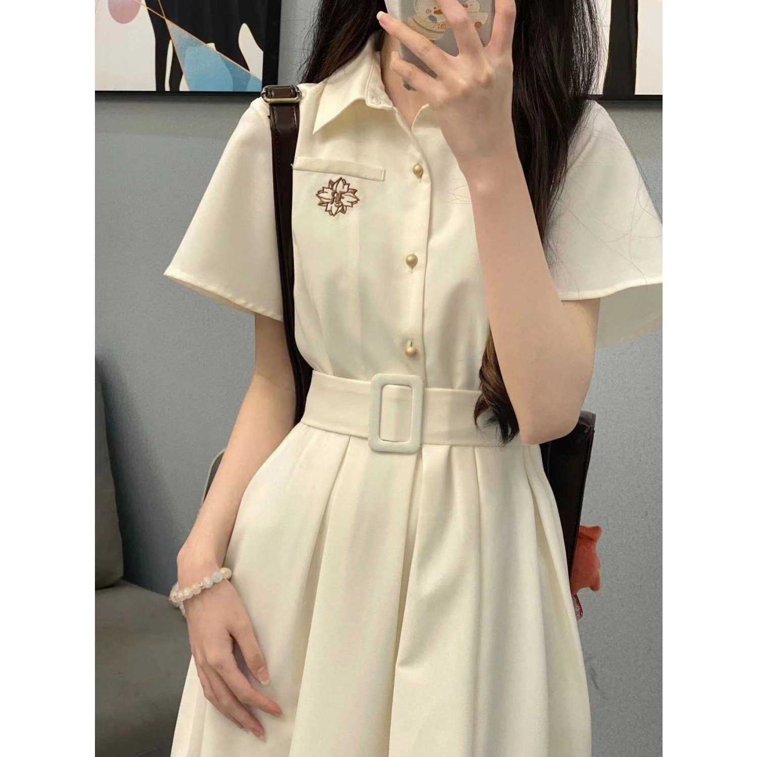 韩版学院风polo领连衣裙夏季甜美蝴蝶结学生刺绣中长款显瘦a字裙