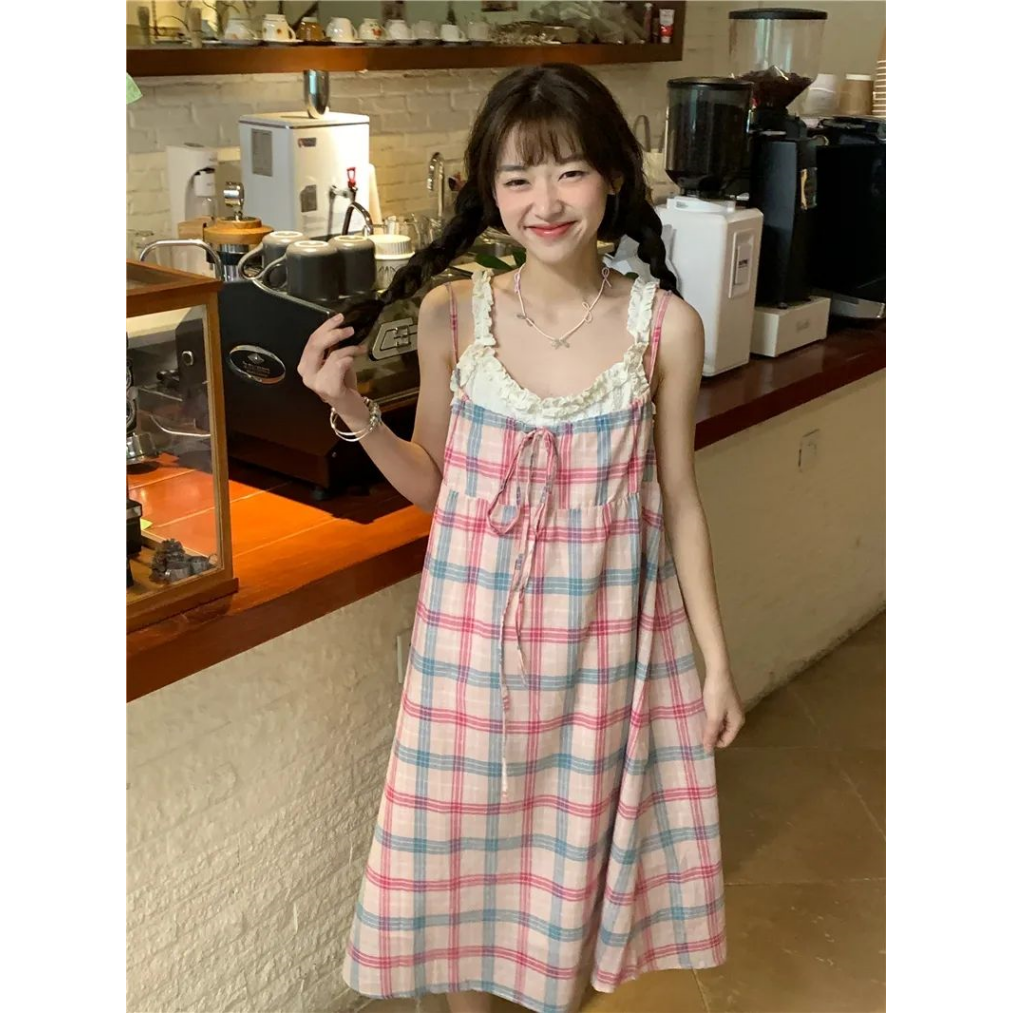 学院风韩版宽松格子吊带连衣裙女学生软妹甜美过膝公主裙假两件衫