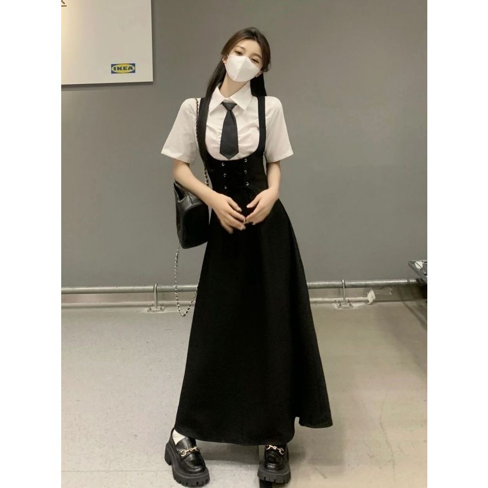 单件套装学院风吊带连衣裙女学生韩版宽松中长款百搭过膝背带裙子