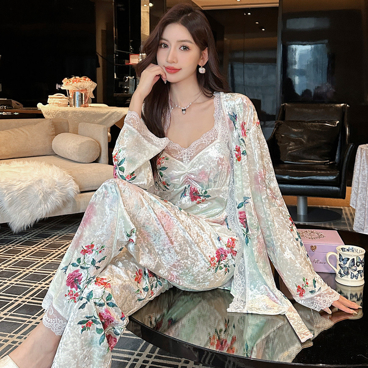 睡衣女款金丝绒春秋2025新款带胸垫三件套装秋冬季性感加厚家居服