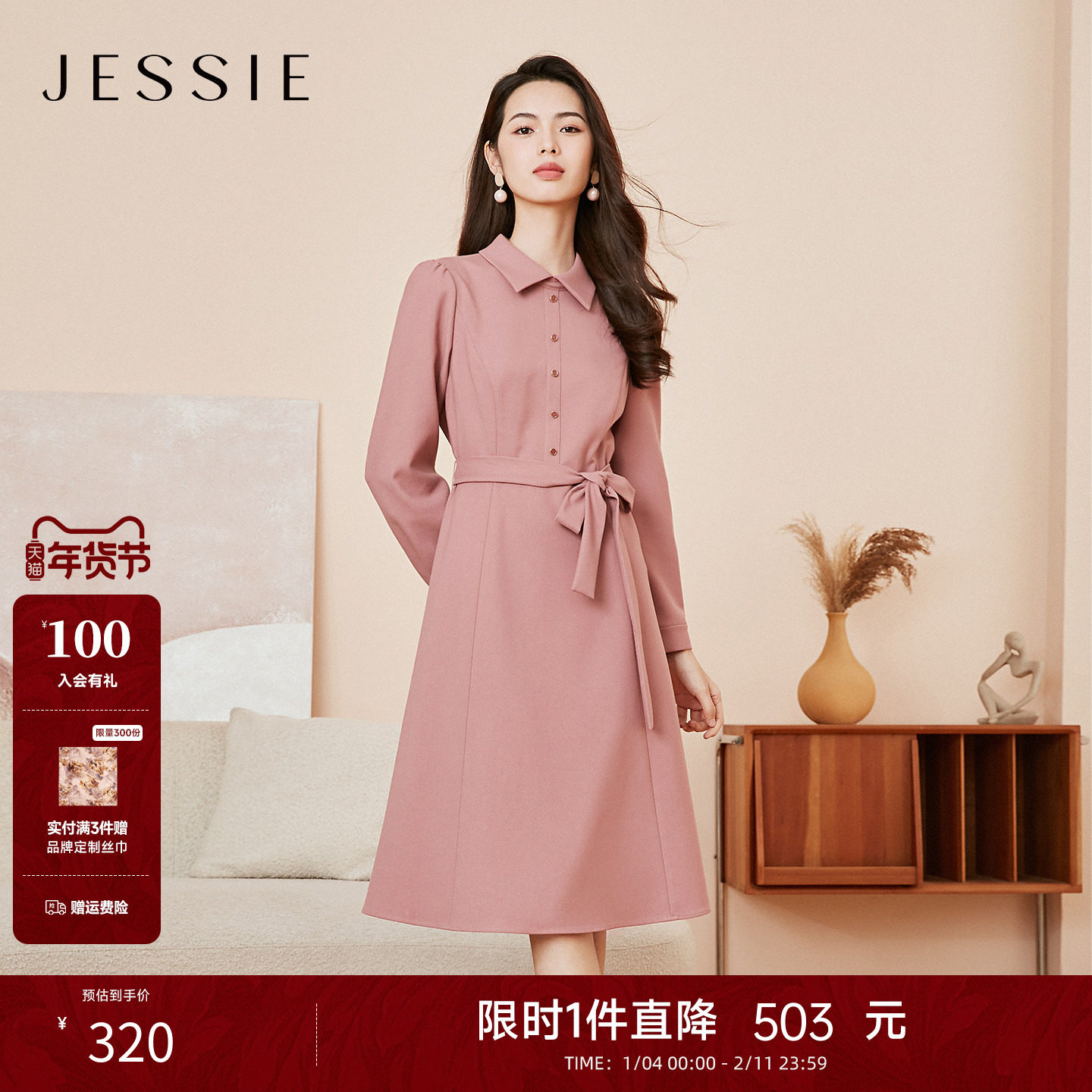 JESSIE优雅束腰衬衫连衣裙女圆领修身显瘦长袖中长裙25年秋季新款