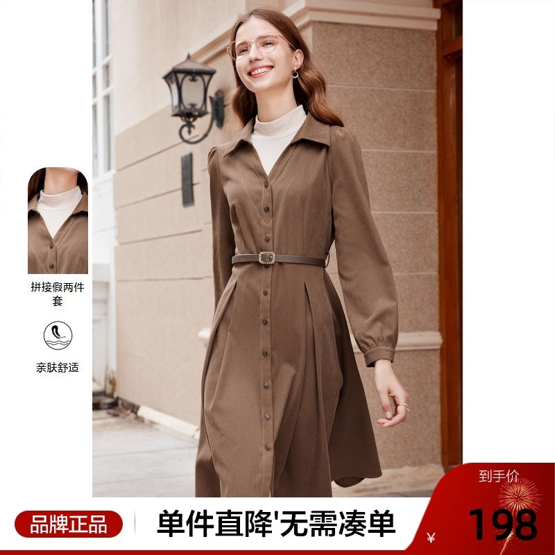 官网细灯芯绒长袖连衣裙女2025冬季新款翻领大码纯棉中长裙衬衫裙