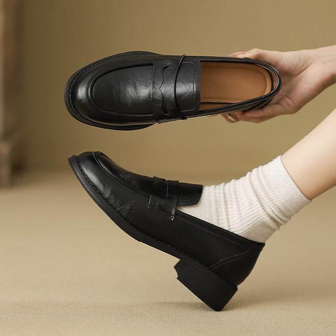 羊皮版~粗跟厚底乐福鞋女2025新款黑色高跟单鞋百搭英伦风小皮鞋
