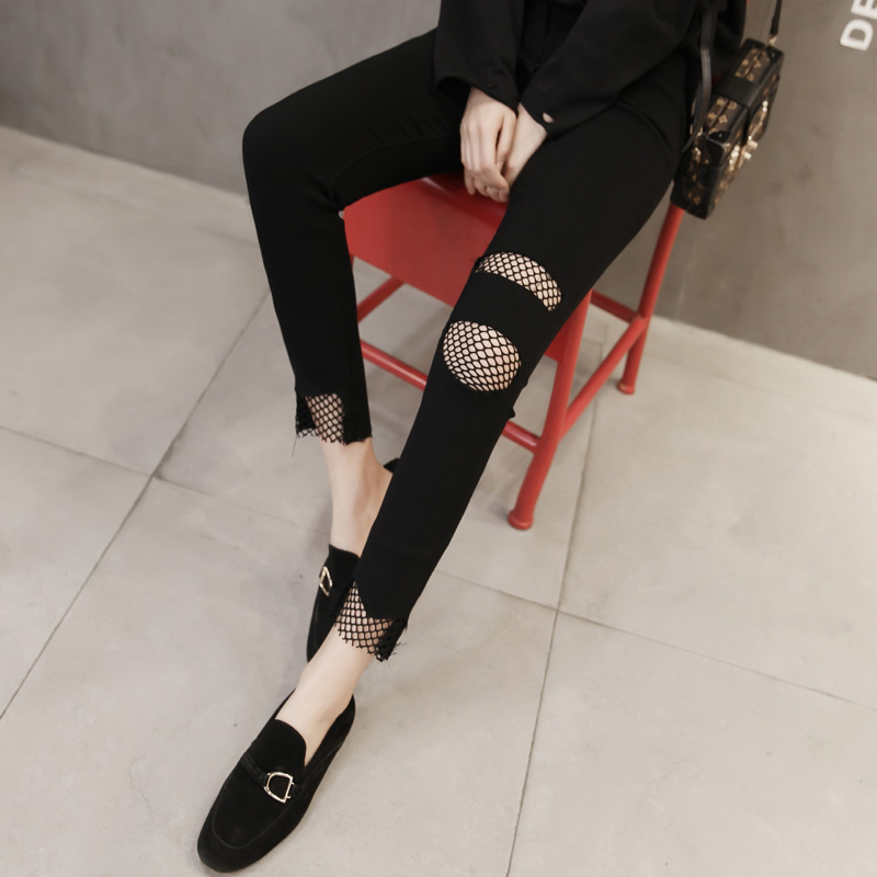 蕾丝打底裤女春秋九分裤2024新款韩版百搭显瘦网纱外穿破洞渔网裤
