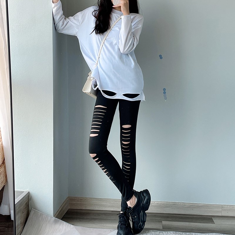 打底裤女外穿2023春夏新款韩版弹力高腰紧身黑裤子破洞小脚乞丐裤