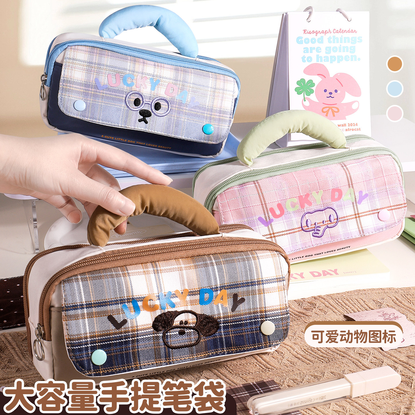 三年二班 软绵绵卡通动物手提笔袋小众不撞款2026新款便携日韩风高颜值ins风女孩男孩小学生大容量文具铅笔盒