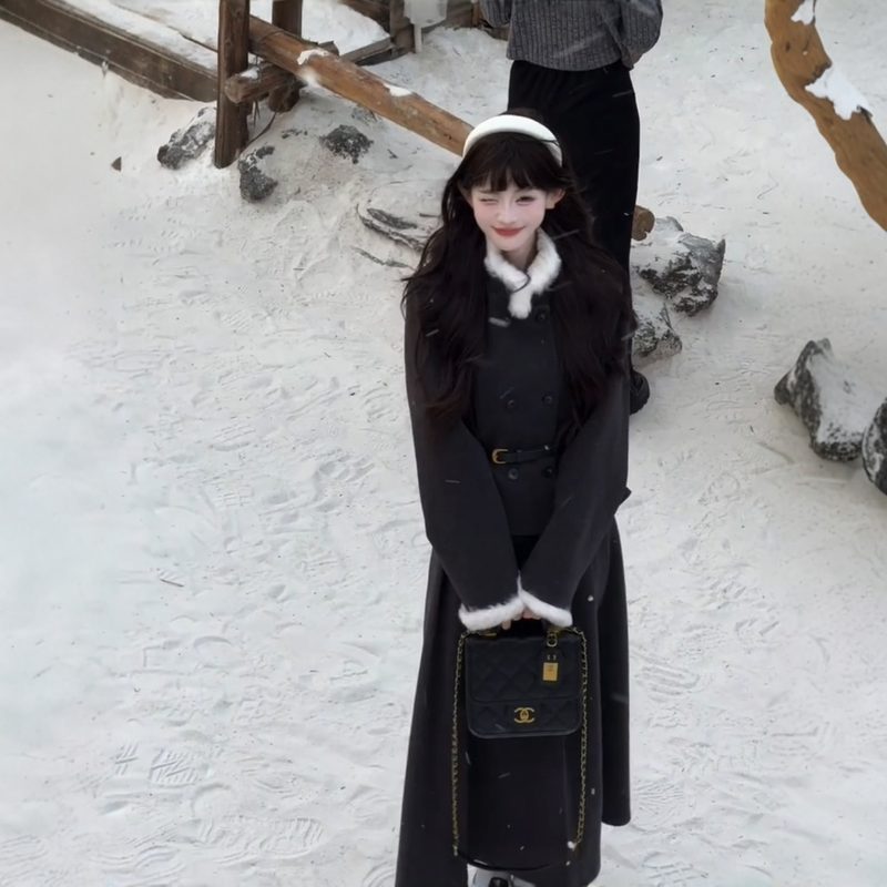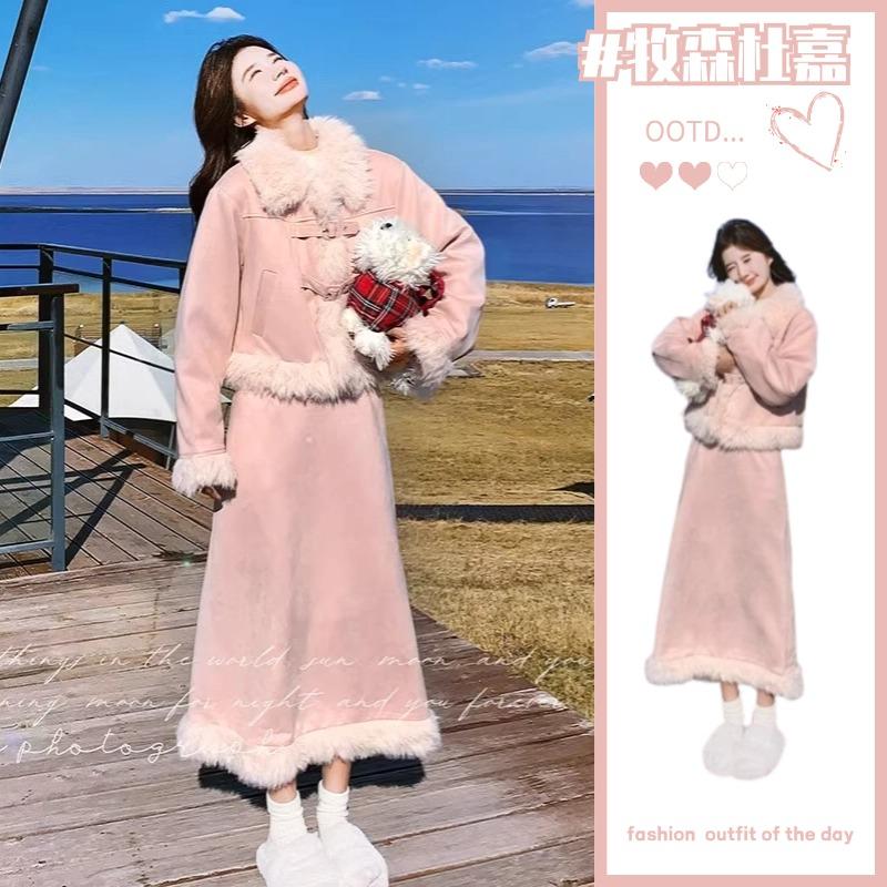 韩系小香风套装秋冬大码毛领保暖外套半身裙大方得体穿搭一整套女