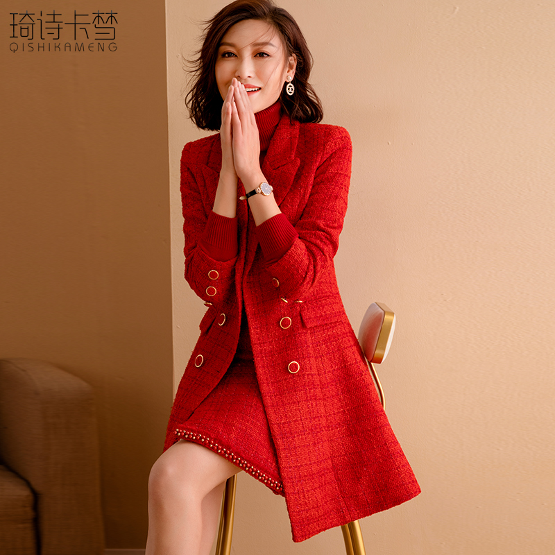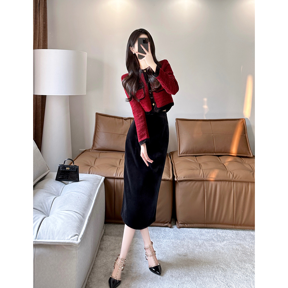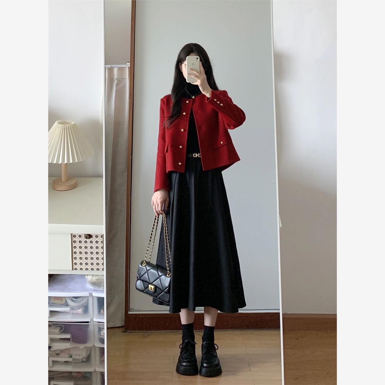 小香风套装秋冬新款韩版复古红色毛呢外套+半身长裙高级感两件套