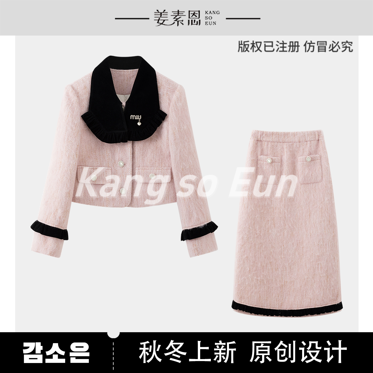 法式小香风粉色毛呢套装女秋冬装高级感气质显瘦上衣半身裙两件套