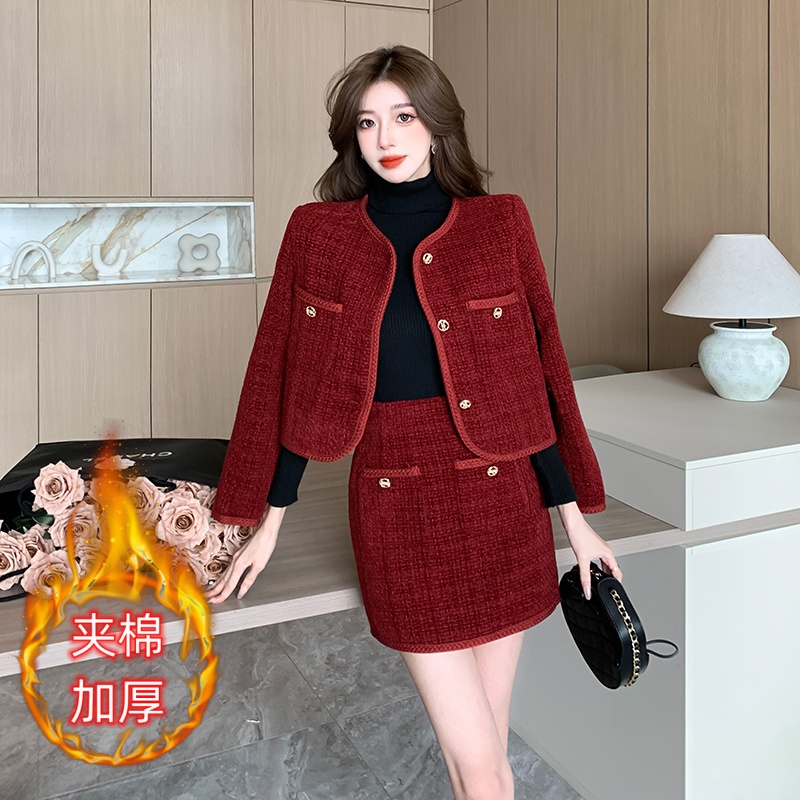 订婚红色小香风套装女秋冬季新款高级感气质名媛过年半身裙两件套