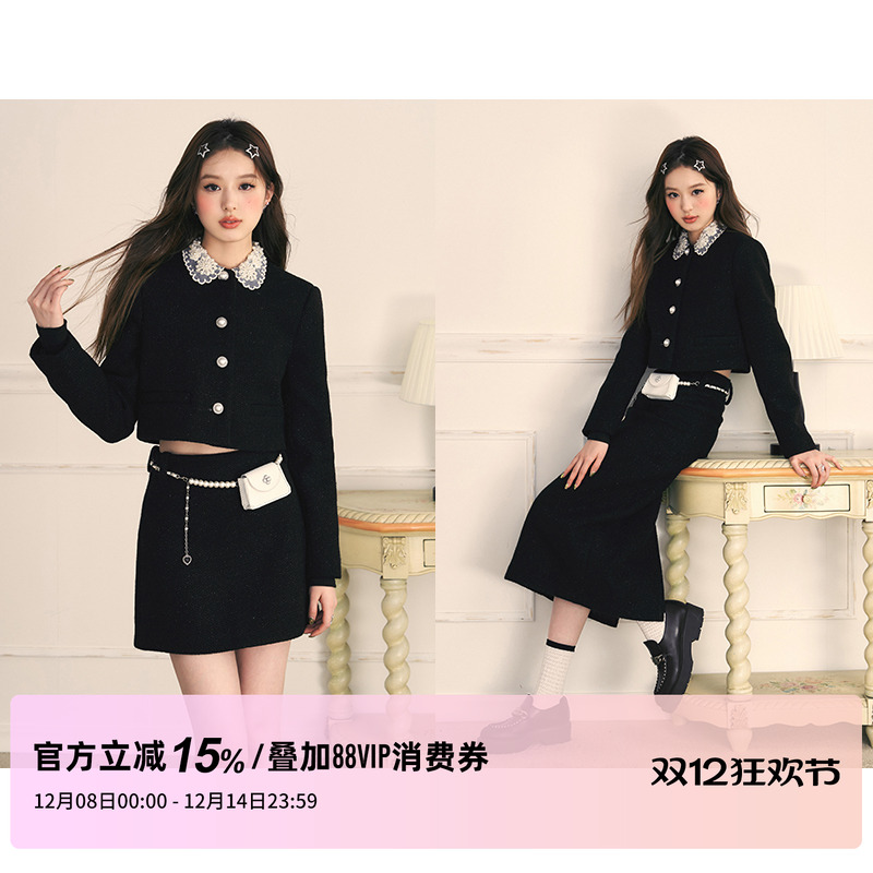 1P STUDIO原创设计 茜茜公主小香风套装秋冬娃娃领外套半裙两件套