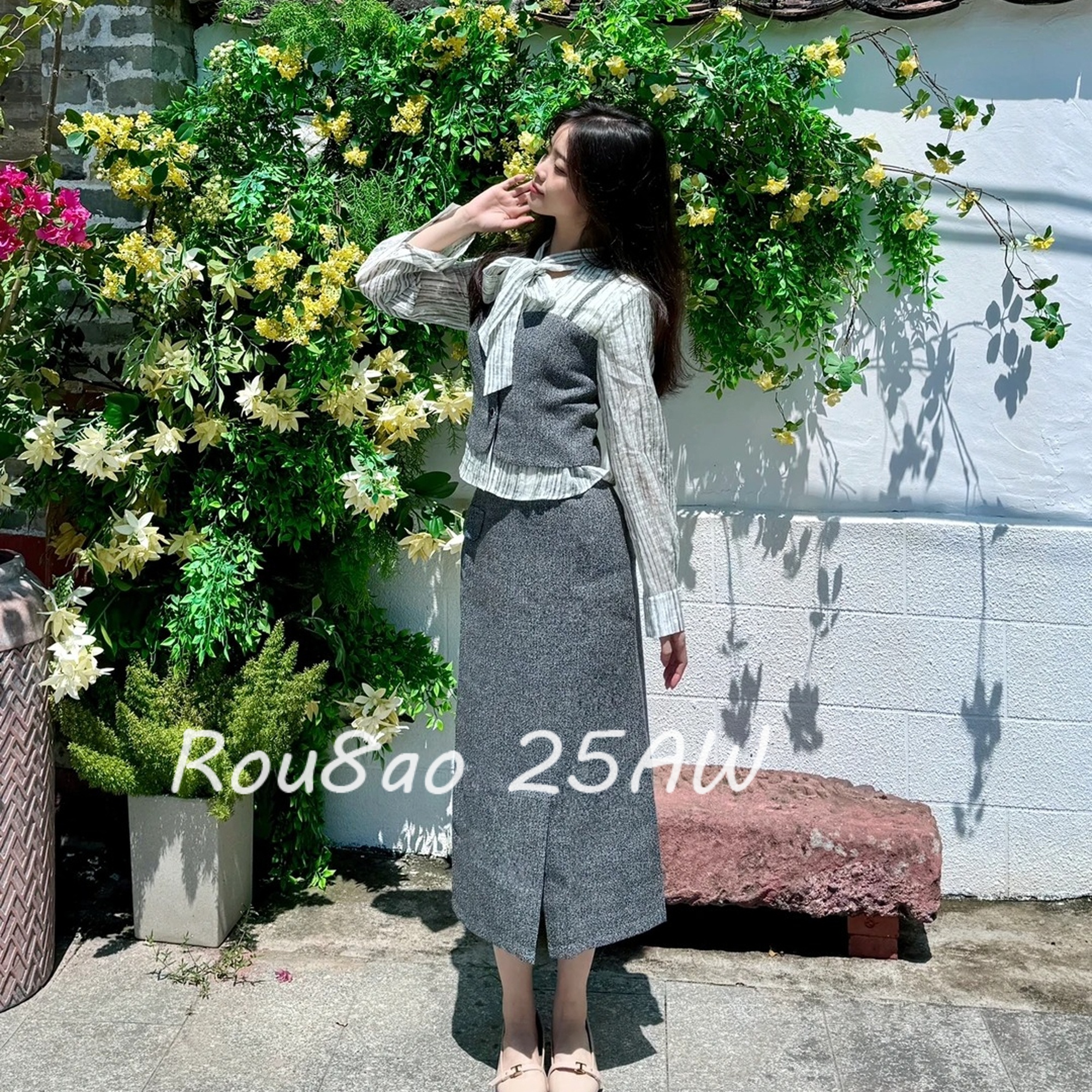 Rou8ao微胖大码女装小香风套装秋冬季轻熟风系带衬衫半身裙两件套