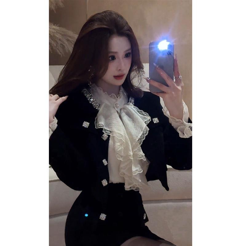 浅布调QBD春秋冬黑色千金小香风套装加绒加厚西装外套+气质短裙女