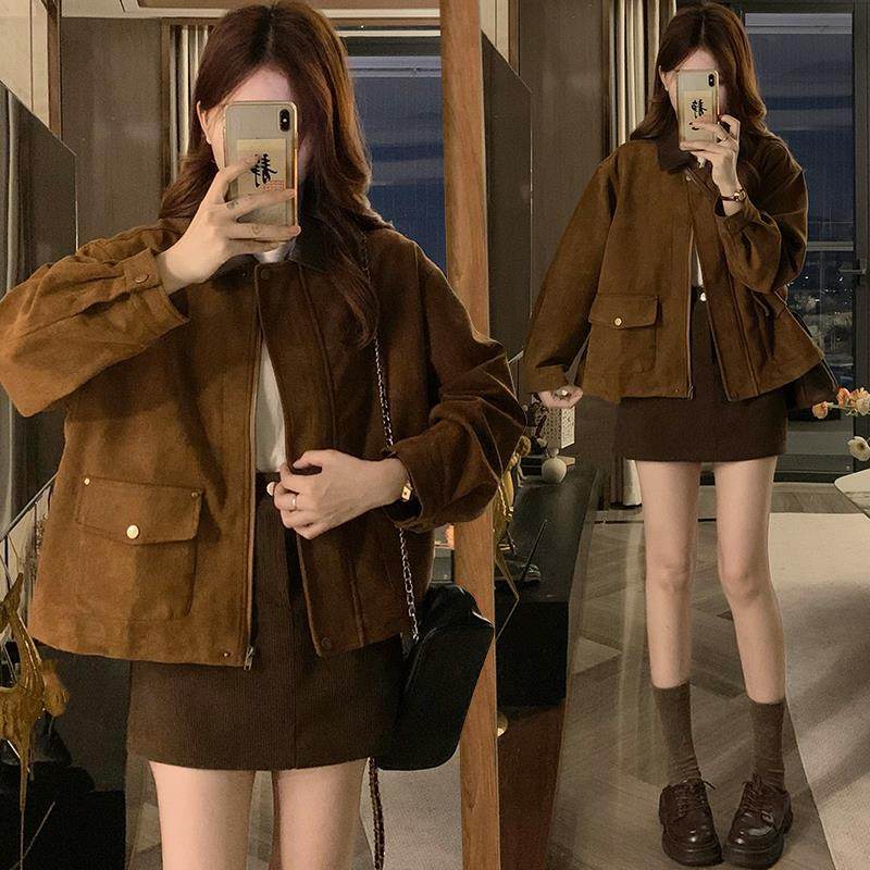 高中女生秋季短款翻领夹克宽松韩版小个子初中学生时髦麂皮绒外套