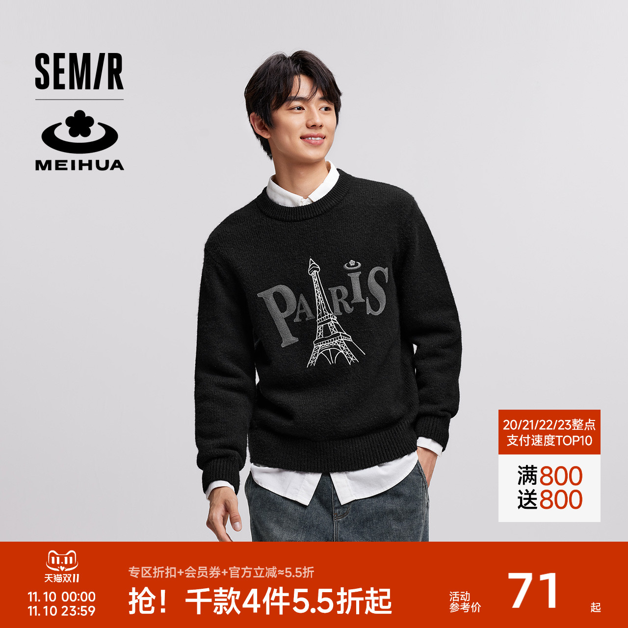 森马毛衫男冬季满版提花针织衫撞色情侣毛衣宽松套头衫提花潮-TK