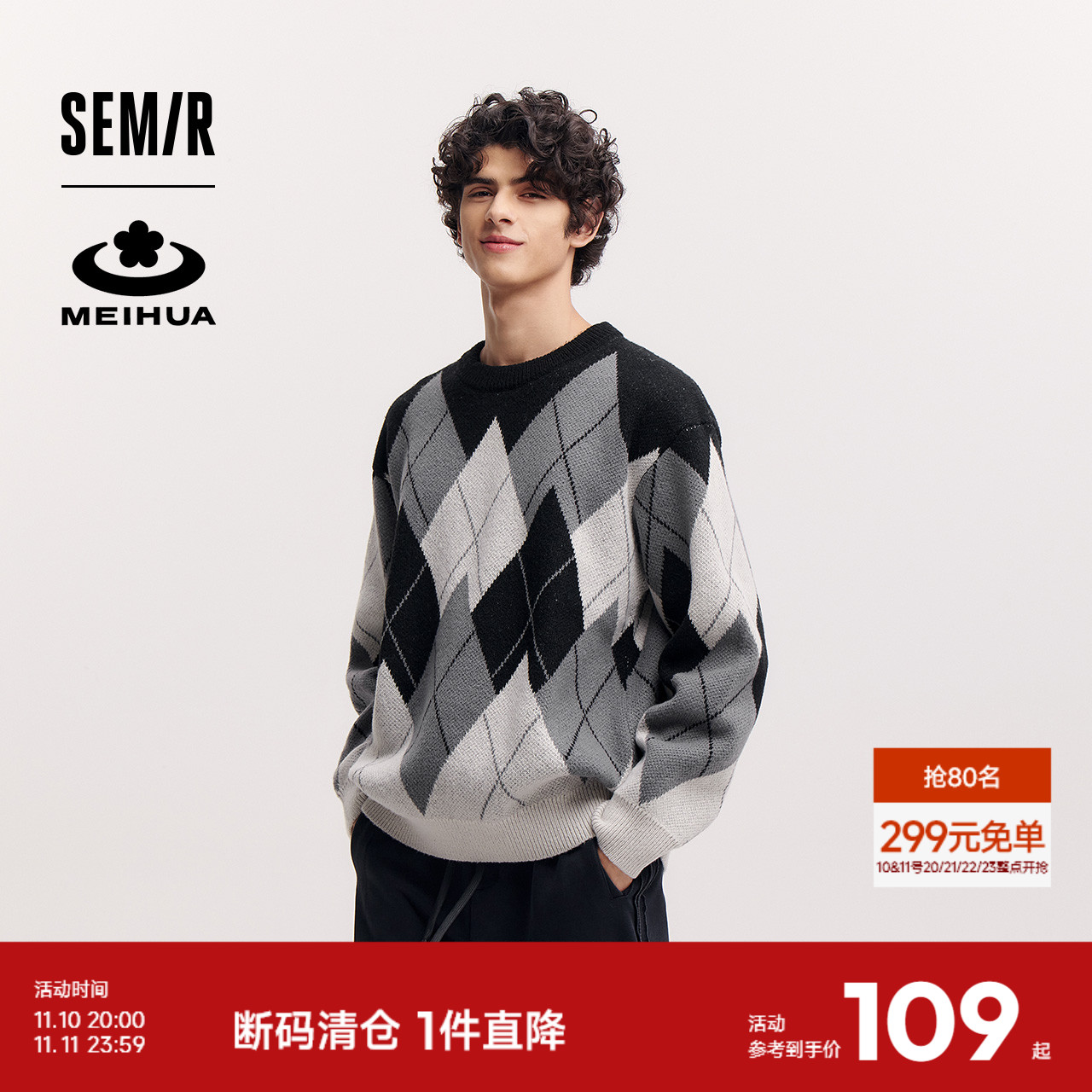 森马梅花系列毛衫男冬季撞色菱格提花针织衫经典复古情侣毛衣宽松