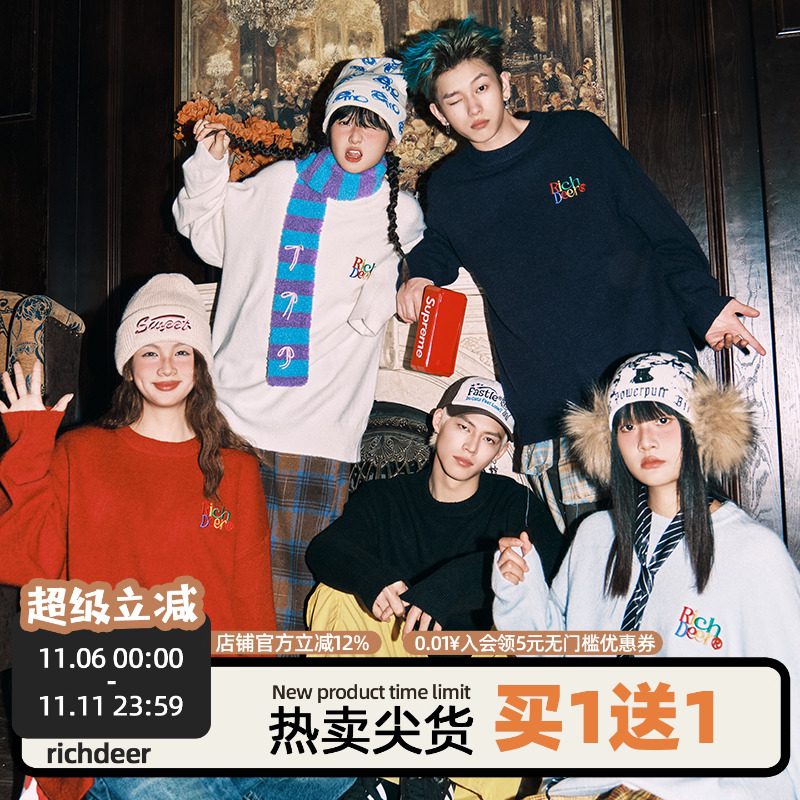 RICHDEER冬季国潮牌基础logo宽松针织衫情侣毛衣宽松撞色圆领上衣