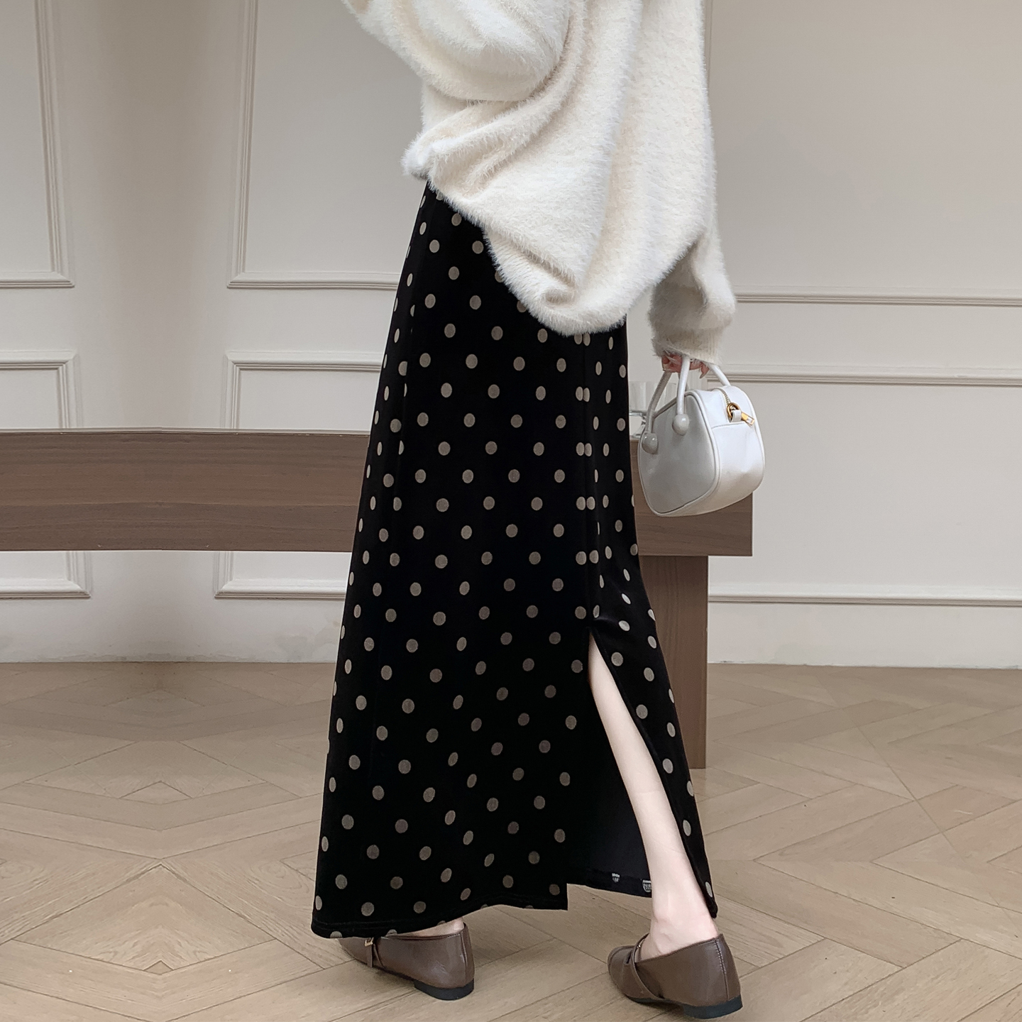 misslady柔软波点黑色丝绒半身裙子女高腰垂感a字遮胯显瘦中长款
