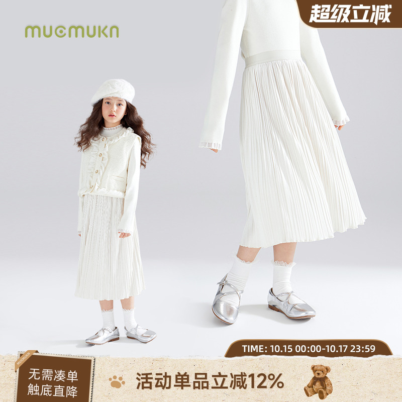 女童初秋法式赫本风裙子光泽丝绒百褶长裙优雅女孩半身裙百搭腰裙