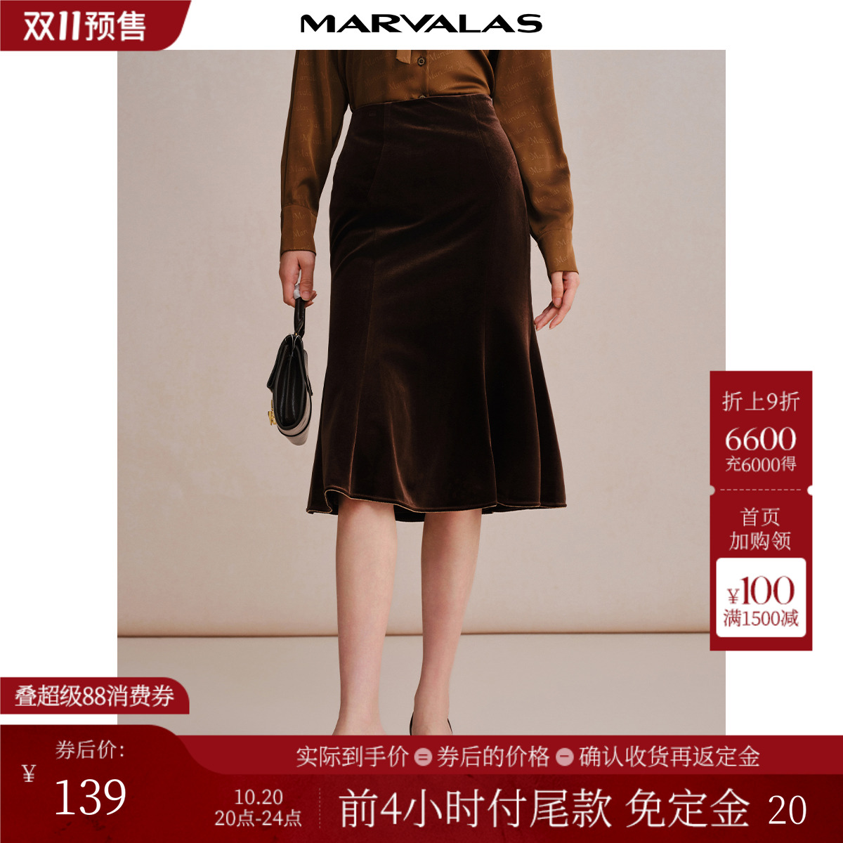 曼德诗复古半身裙2025秋季新品弹力丝绒A摆鱼尾裙子通勤OL长裙