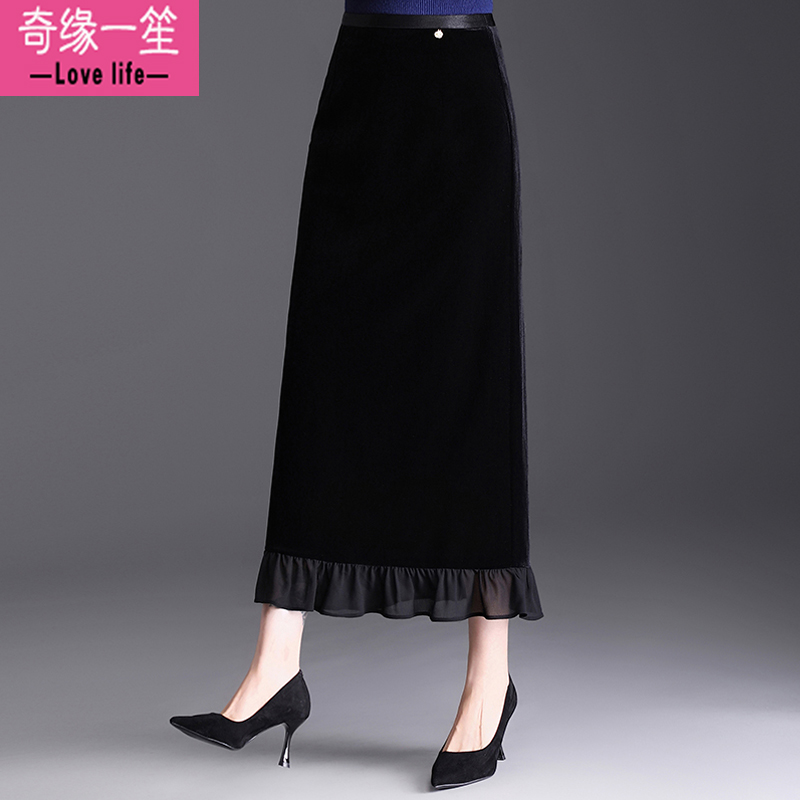 黑色金丝绒直筒半身裙荷叶边裙子女秋季新款气质长裙开叉包臀裙子