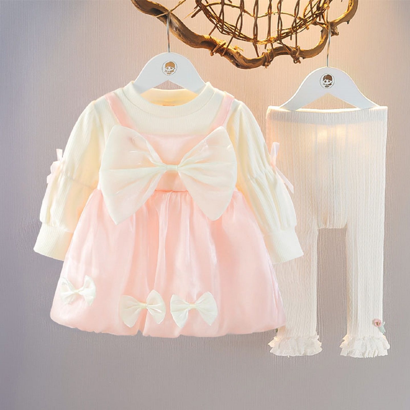 婴儿春秋季韩系套装女宝宝蝴蝶结圆领打底衫上衣百搭外出爱心长裤
