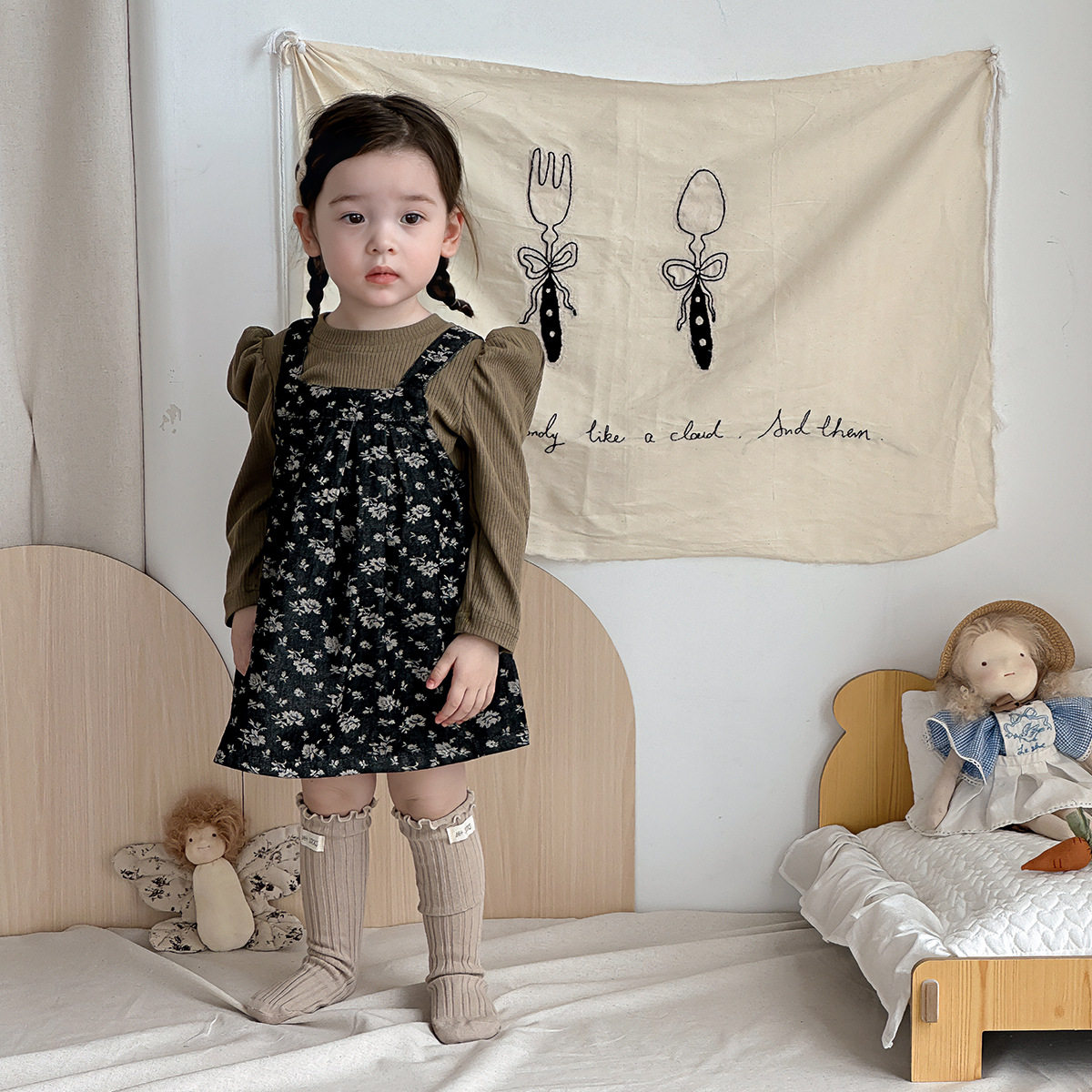 女童秋季套装2025女宝宝韩版焦糖猫咪背心裙花苞裙长袖打底衫两件