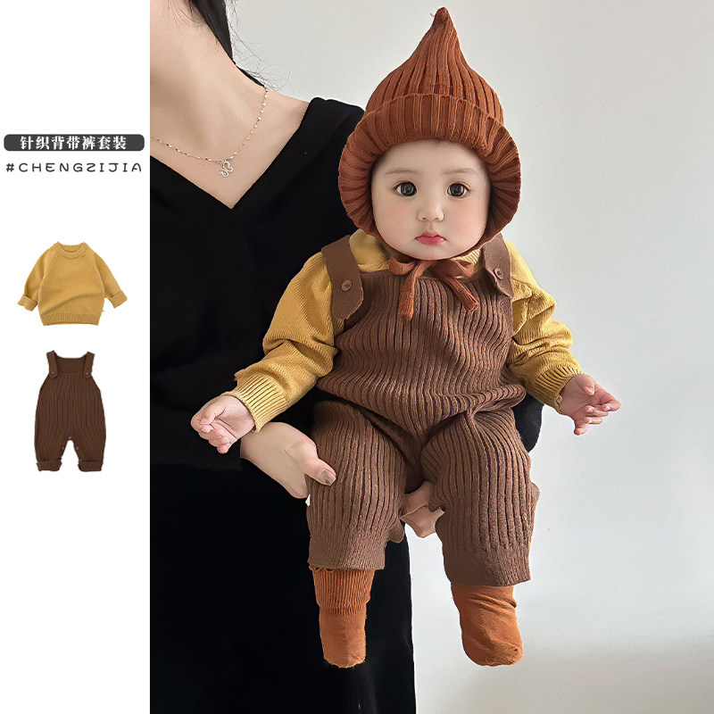 韩系婴儿春秋季针织套装女宝宝纯色百搭哈衣爬服男童洋气套头毛衣