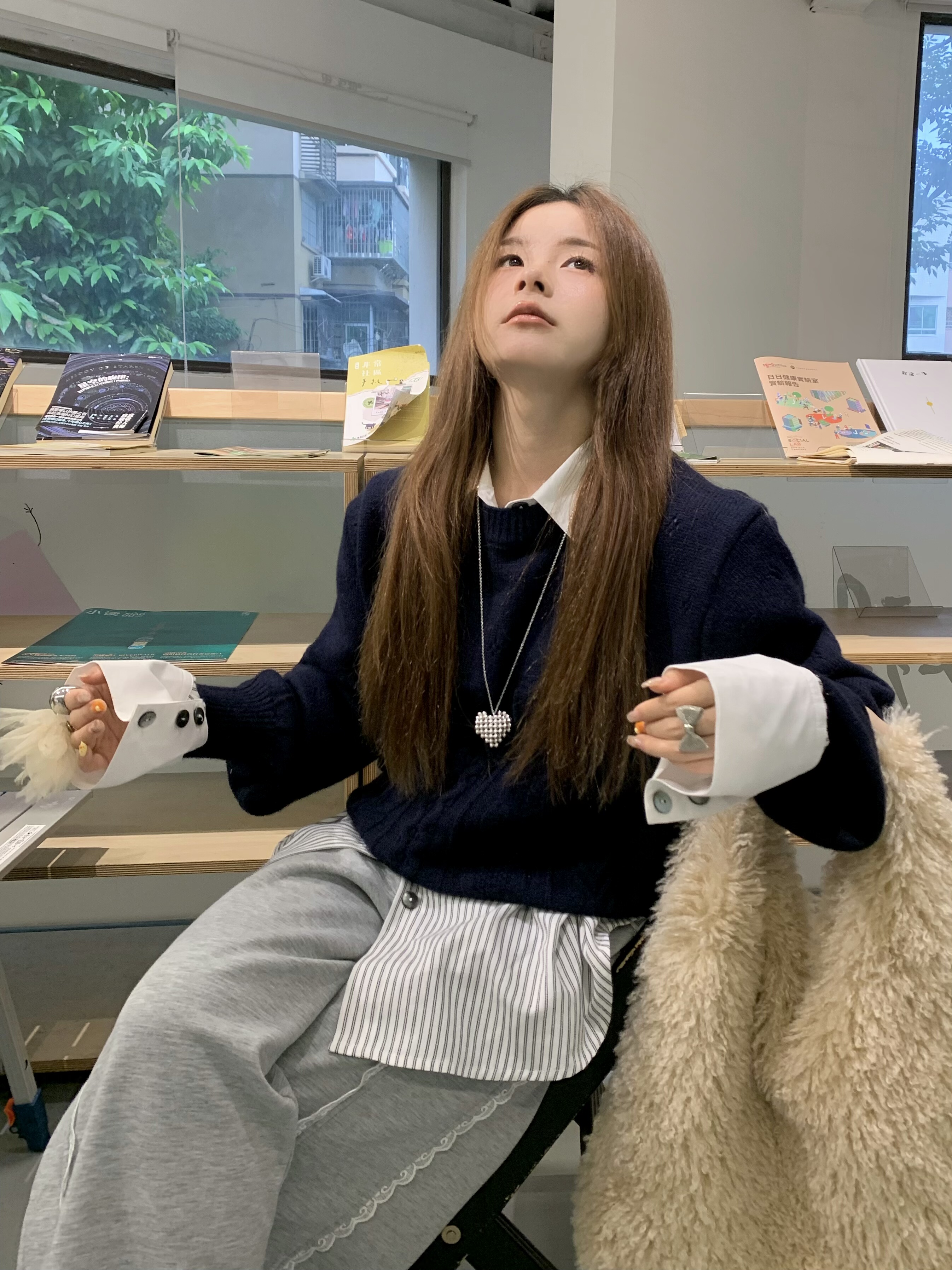 DAMEI大美基础款藏蓝色米白色麻花短款套头毛衣 短款马海毛针织衫