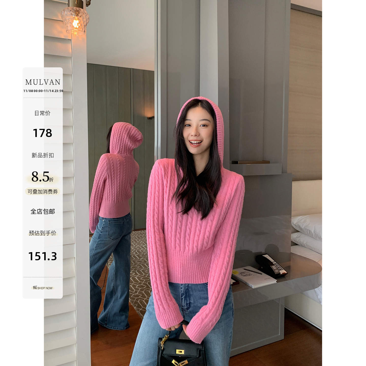 MULVAN 秋日手稿 麻花v领连帽毛衣女修身显瘦短款套头针织衫上衣