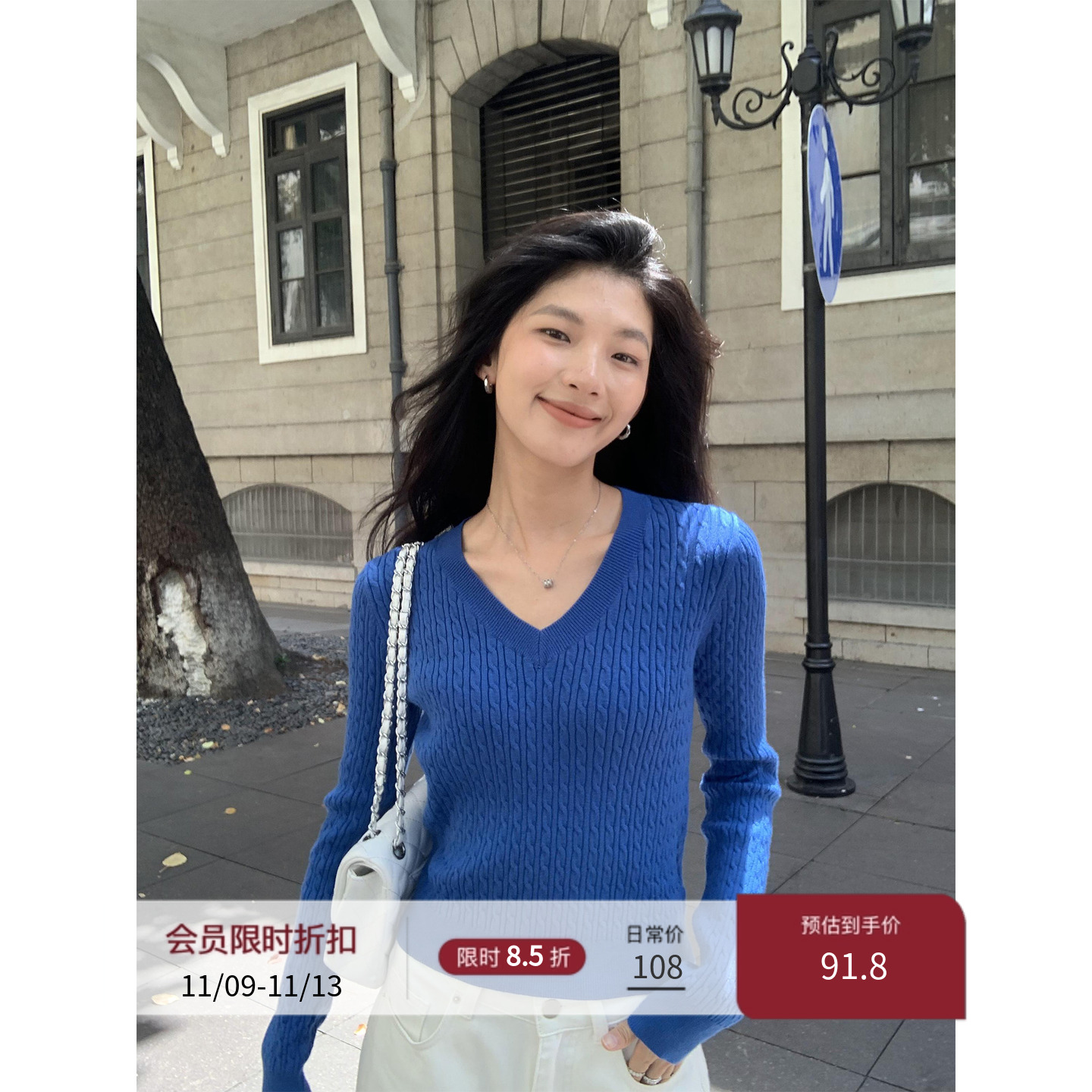 MULVAN 复古麻花v领针织衫女秋短款修身内搭打底上衣长袖套头毛衣