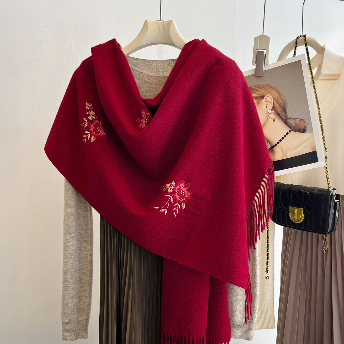 红色围巾女2025新款冬季新娘结婚旗袍披肩外搭羊绒感妈妈披风斗篷